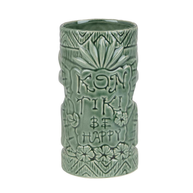 Kon Tiki Mug Green o objemu 500 ml je keramický hrnek, který se používá na servis tropických TIKI koktejlů jako například Mai Tai nebo Zombie. Tiki koktejly jsou míchané nápoje plné rumů, likérů a čerstvých ovocných šťáv servírovaných právě v keramických Tiki pohárech a bývají bohatě zdobené ovocem všeho druhu.