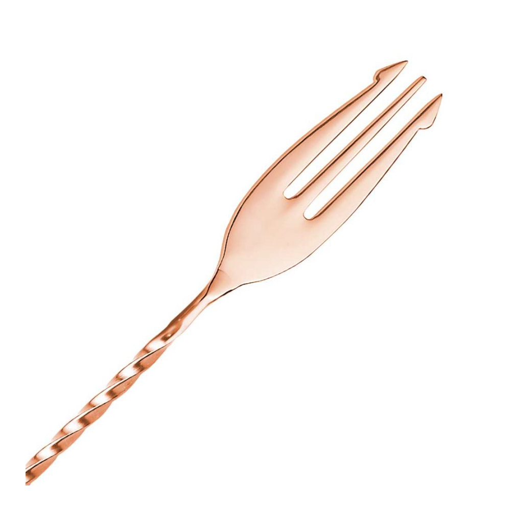 Elegantní míchací lžička s jemným vinutím v měděném provedení o délce 30 cm. Nezbytná kamarádka míchací sklenice k přípravě klasických koktejlů. Vinutí v celé délce lžičky je ukončeno vidličkou a zabraňuje proklouznutí lžičky v ruce.