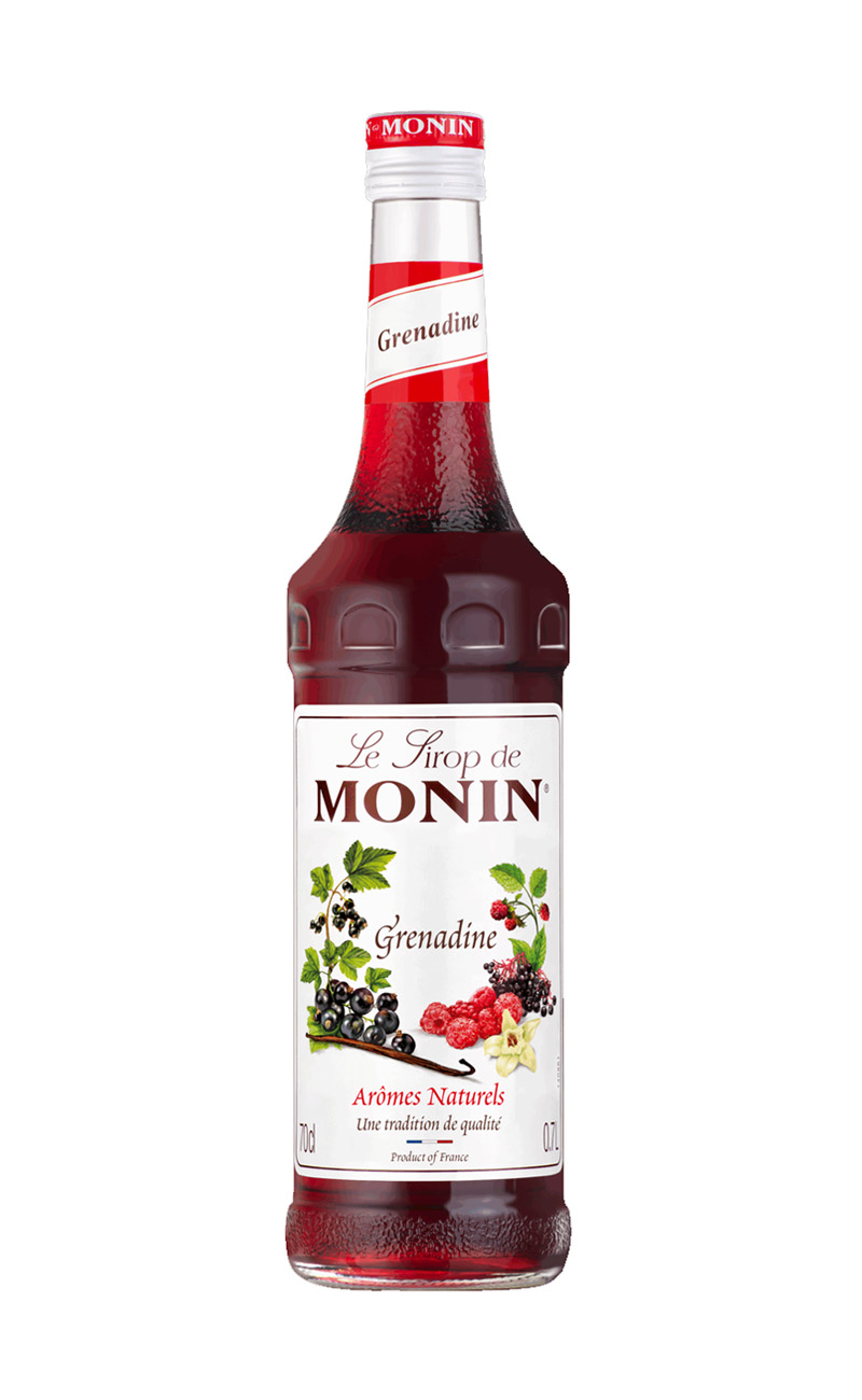 MONIN Grenadina je bezpochyby nejvšestranější a nejpoužívanější sirup v klasickém barmanství a bývá součástí celé řady receptur. Koktejlům obsahujícím Grenadinu propůjčuje výraznou červenou barvu a sladkou, lehce trpkou chuť, ktrerá je velice oblíbená jak u dětí, tak dospělých. MONIN Grenadina bývá často považován za sirup z granátových jablek, ale není to pravda. Chuť je složena z černého rybízu, malin, černého bezu a tóny vanilky.