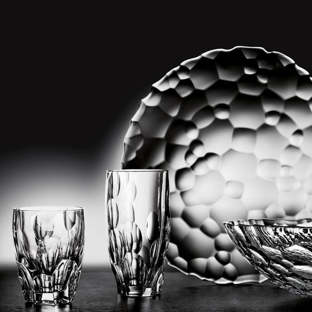Jak říká autor kolekce Roman Kvita, design vychází z kulovitého tvaru, který je základem pro další strukturování skla. Vypouklé, zakulacené tvary vytváří nádherné světelné odlesky, které dodají nádech luxusu každodenní tabuli i při slavnostních příležitostech. Dotkněte se umění a mistrného designu z rukou českého autora.