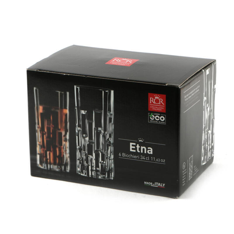 Zdobená lisovaná sklenice highball Etna o objemu 340 ml s moderním designem "brusu" z italské sklárny RCR CRYSTAL. Stabilní sklenice se silným dnem vhodná na dlouhé koktejly, džusy, vodu nebo domácí linonádu.