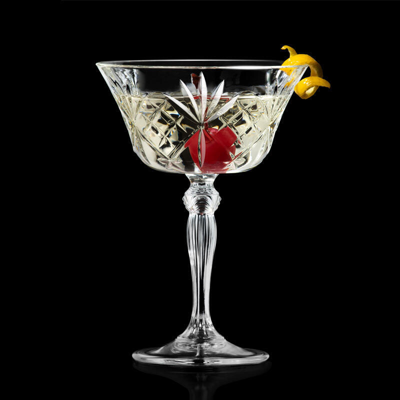 Zdobená lisovaná sklenice kupetka Melodia o objemu 260 ml s moderním designem "brusu" z italské sklárny RCR CRYSTAL. Stabilní sklenice s krásně zbobenou nožičkou vhodná pro servis krátkých nápojů nebo jako sklenice na šampaňské.