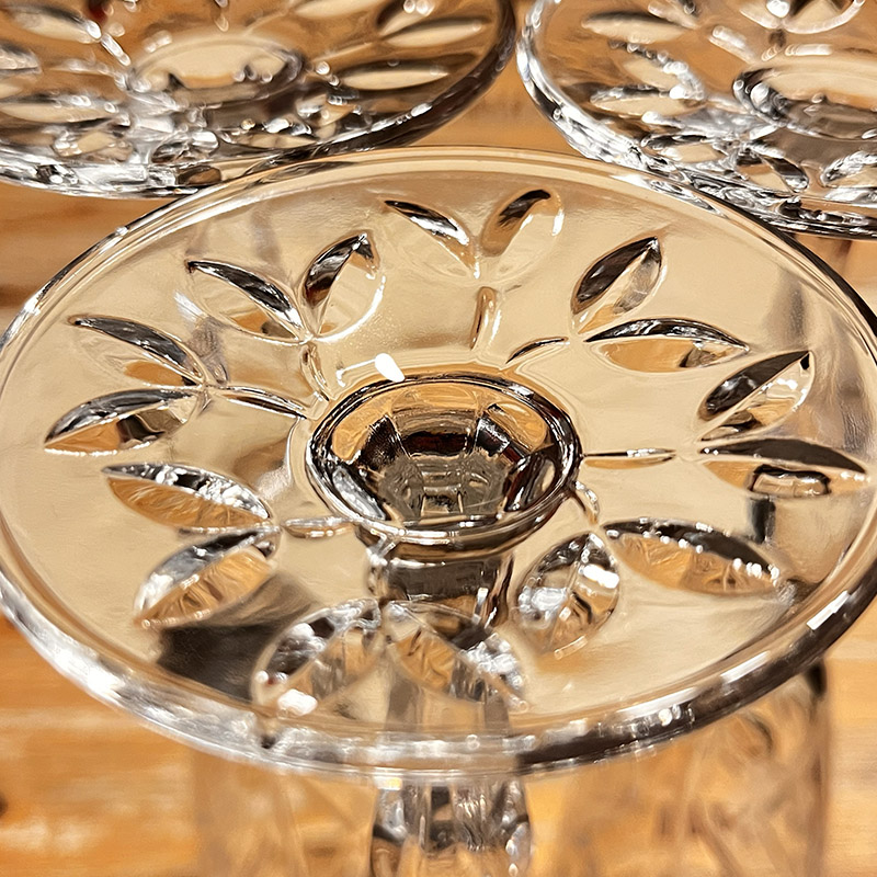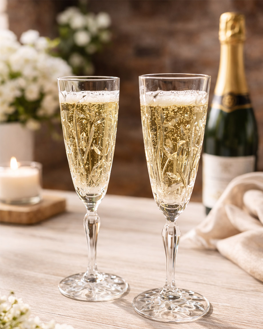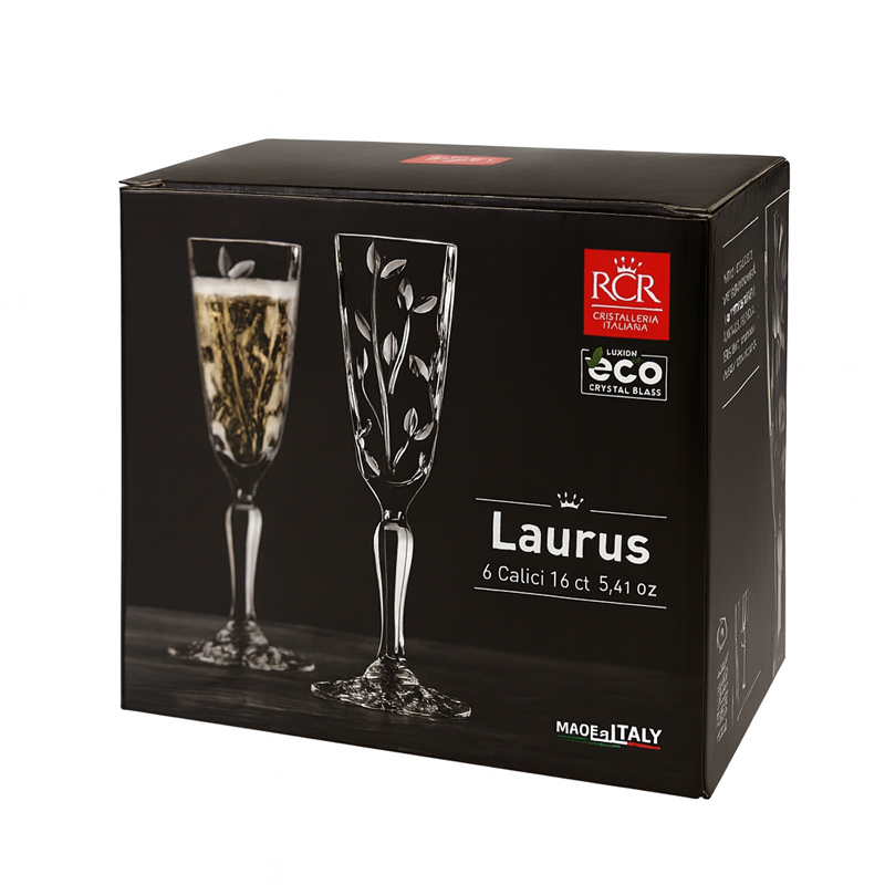 Zdobená lisovaná sklenice na šampaňské Laurus o objemu 160 ml s moderním designem "brusu" z italské sklárny RCR CRYSTAL. Stabilní sklenice s krásně zbobenou nožičkou vhodná pro servis sektu, cavy, šampaňského nebo šampaň koktejly.